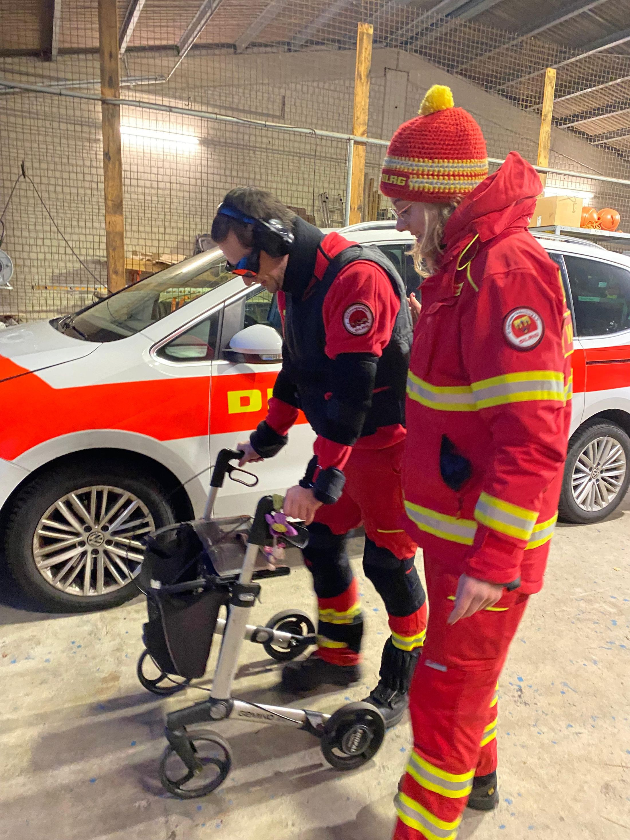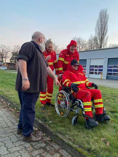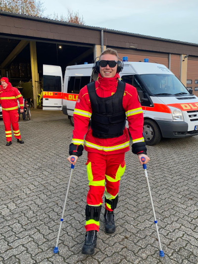 Während dieser Übungen haben wir erfahren, wie überraschend anstrengend selbst kleinste Bewegungen waren. Manche Situationen zeigten, dass man sich zeitweise ausgeliefert oder unsicher fühlen kann. Eine persönliche Erfahrung, die uns im Einsatzfall wichtige Hinweise darauf gibt, welche Art von Unterstützung Betroffene tatsächlich benötigen. Auch wurde uns deutlich, wie stark sich die Wahrnehmung verändert, wenn die Sicht eingeschränkt oder die Beweglichkeit reduziert ist.