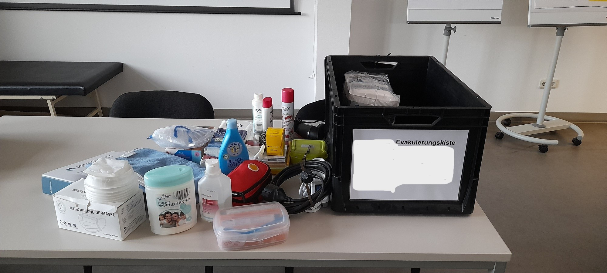Außerdem wurde sich eine mögliche Evakuierungskiste angeschaut, welche Betroffene als zusätzliches Gepäcl im Ernstfall mitführen könnten, Dieses reichte von persönlichen Hilfsmitteln bis hin zu medizinischem Bedarfsprodukten. Diese Erkenntnisse sind besonders wichtig für unsere Führungskräfte, die Evakuierungen planen und entsprechend realistisch kalkulieren müssen, wie viel Platz und Zeit benötigt wird.